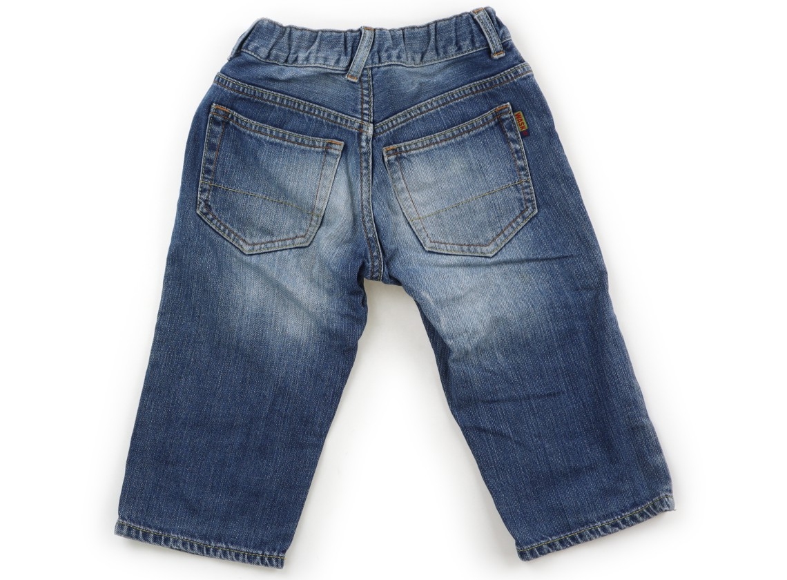 デニム生地、サイズ調整ゴムが付いています。ひざやお尻に薄い黄ばみや汚れが見受けられます。普段使いにいかがでしょうか。