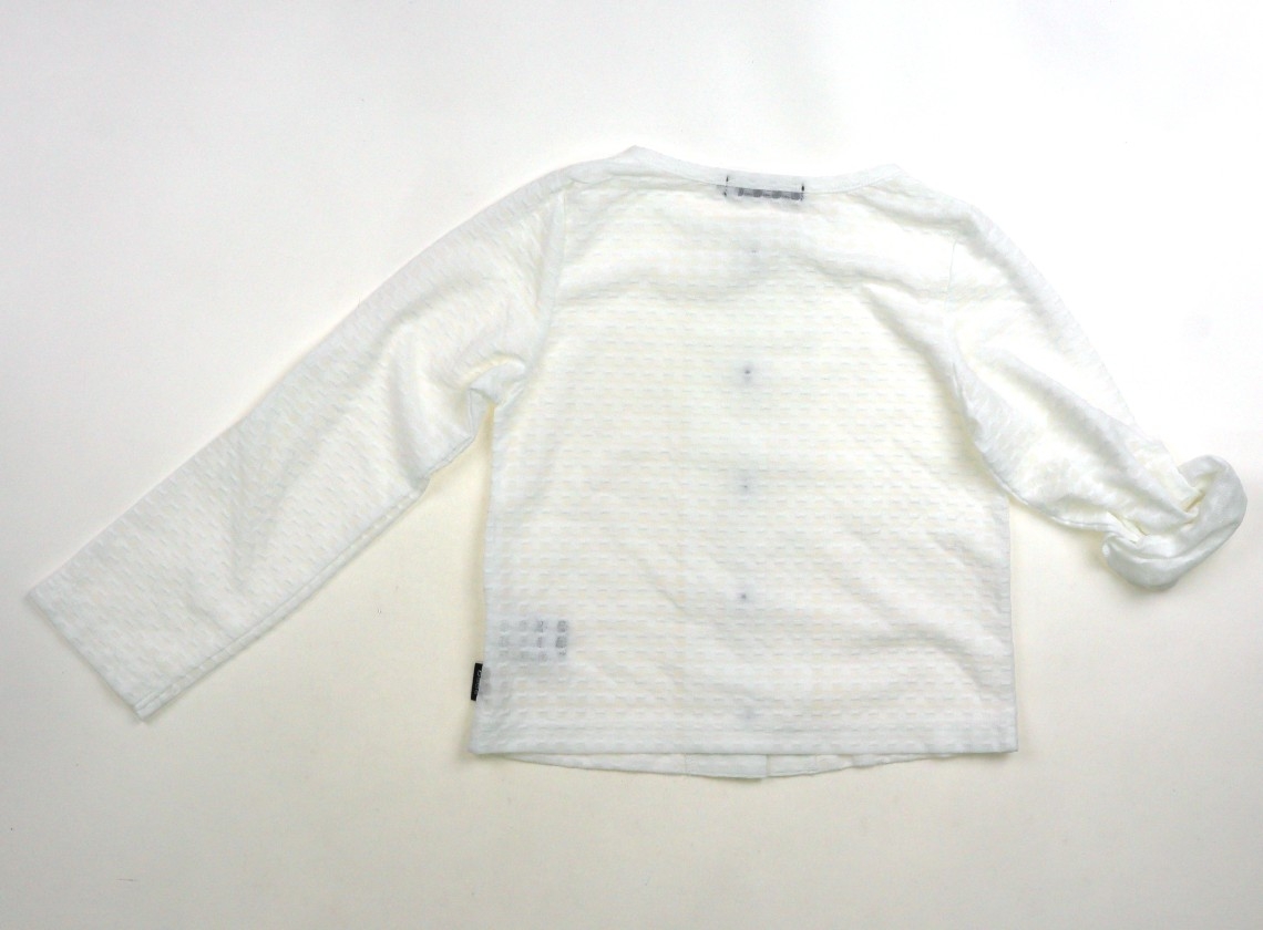ポリエステルレーヨン素材の透け感のある薄い生地。腹部付近に引っ掛け傷が見られます。まだお使いいただけそうです。