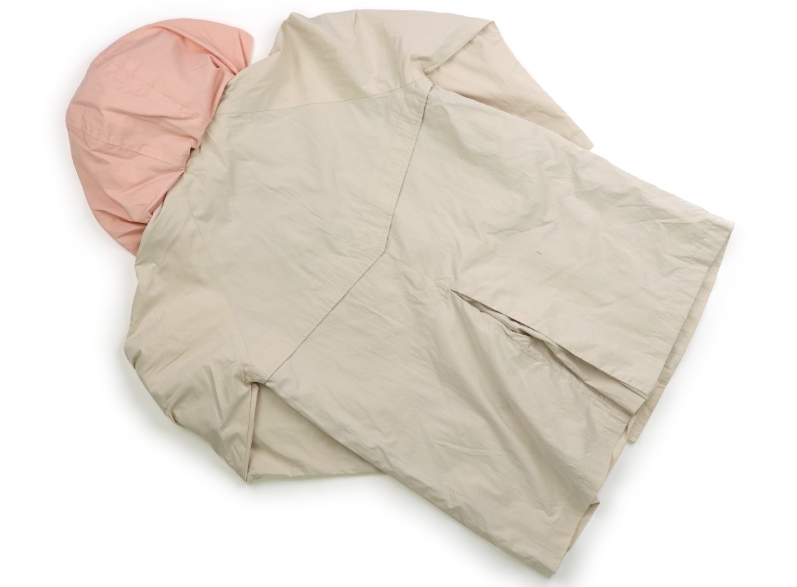 実際のサイズ表記は9/134cmです。フードの取り外しが可能です。ポリエステルのシャカシャカ生地で裏地なし。お尻に茶色い汚れが2つほどあります。